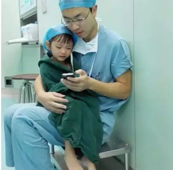 一组温情的照片爆红网络:一个两岁零9个月的可爱小萝莉,在省儿保做心脏手术,进入手术室后害怕得哭了,年轻的医生叔叔石卓,将小女孩轻抱怀里,让她看手机里的卡通画来安慰她,暖心的画面被麻醉师拍下,感动了无数人。